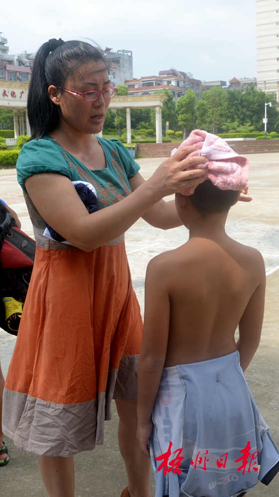 ?利用休息時(shí)間,家長(zhǎng)趕緊為輪滑隊(duì)員擦擦汗。