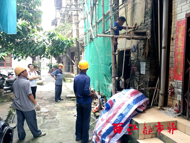 ????當天一早,記者來到萬秀區百花沖片區百花路東二巷42號,這棟有著幾十年房齡的磚木結構危舊樓外面,已經搭好了防護網和竹棚,并設置了警戒線,施工人員們正有條不紊地進行房屋拆除工作。