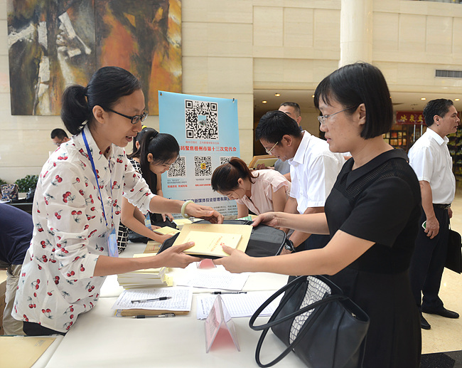 大會駐地簽到處工作人員正在準(zhǔn)備報(bào)到資料。