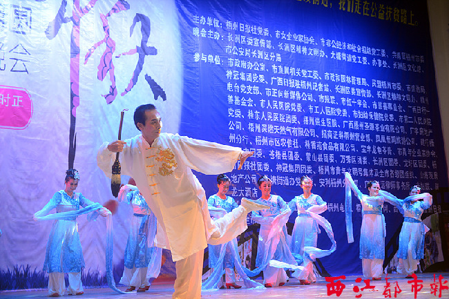 ??? 9月2日,2016月圓中秋公益扶貧文藝晚會在市政廣場小舞臺舉行。圖為紅袖藝術團在晚會上表演舞蹈《西江美》。 西江都市報記者 蒙紹松/攝