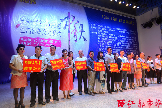????西江都市報訊(記者 黃穎盈)9月2日晚,梧州市2016月圓中秋公益扶貧文藝晚會在市政廣場小舞臺舉行。此次活動由梧州日報社黨委、梧州市女企業家協會、梧州市非公經濟和社會組織黨工委、共青團梧州市委聯合主辦,共為40個貧困村、30戶社區貧困戶以及10戶殘疾貧困戶在中秋佳節來臨之際送上物資捐助和暖心慰問。