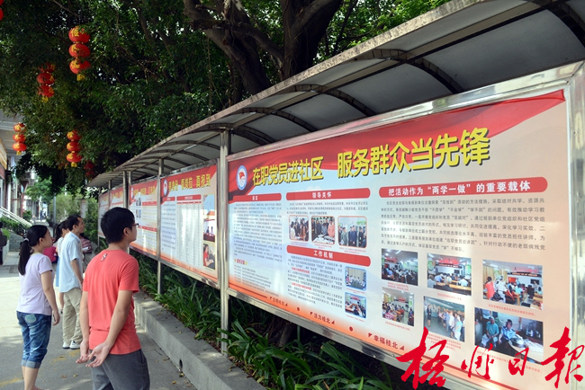 2016年9月1日,在桂北社區(qū),一些前來(lái)辦事的市民群眾正在觀看社區(qū)的黨建板報(bào)。