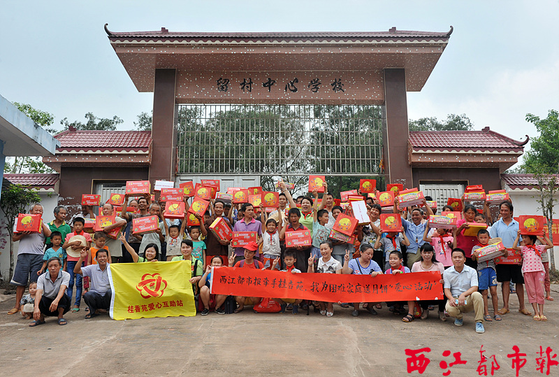 藤縣象棋鎮(zhèn)留村的60戶貧困戶領(lǐng)到了愛心月餅,與愛心家庭一起合影留念。西江都市報記者 陳健新/攝