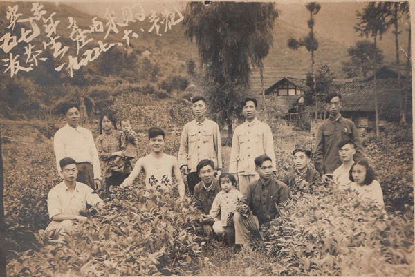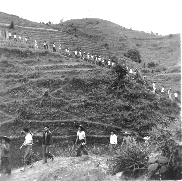 上世紀60年代,為重振六堡茶,大力發(fā)展茶園,當時浩浩蕩蕩的上山種茶隊伍。(陳伯昌提供)