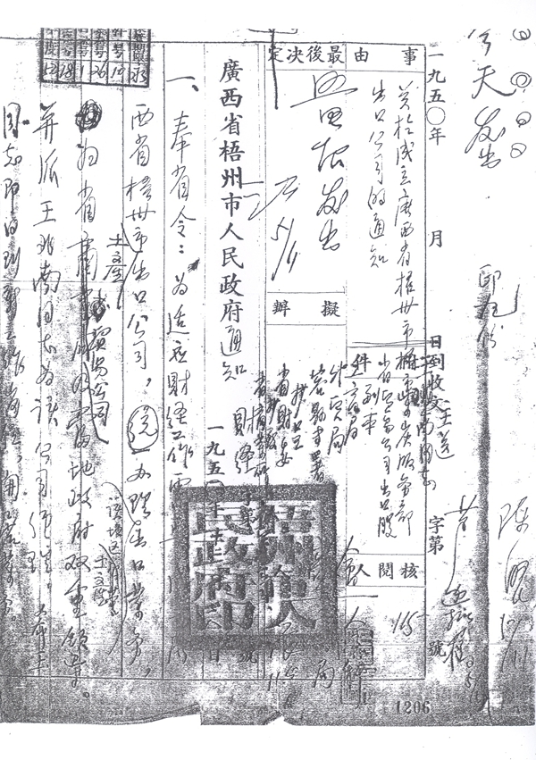 1950 年,我根據(jù)部隊的安排來到梧州。梧州市政府成立后不久,廣州的茶葉進出口公司就和梧州市政府聯(lián)系,想洽談六堡茶銷售的事情,因為六堡茶在國際上很有聲譽。茶葉公司派出張茂偉(音)在大東大酒家對面成立了一個辦事處,并把六堡茶作為主要的經(jīng)營業(yè)務,梧州市政府這邊派我去配合。我和張茂偉就前往武漢的中南區(qū)茶葉公司找技術員。很快,我們就找到了第一批精通制茶的技術員,其中有武漢大學茶葉專業(yè)畢業(yè)的大學生。