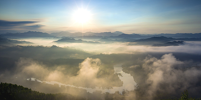 ????逆光看霧,則要爬上湄江以西的山梁,較好的點在明覺村至大化村之間沿國道321線的高山。在這里往東觀,山巒層層疊疊,層次分明,視野開闊,湄江之水逶迤曲折。薄霧時,束束光柱透過氤氳霧氣打在層層山巒上,照在山下村莊上,灑在湄江河水上,光影效果非常好,畫面美輪美奐。濃霧時,霧海平鋪山澗、盤地,波濤滾滾,遠近山頭僅露尖峰,金色的陽光灑在霧面上,非常震撼。遇到有彩霞早晨,天空是金黃色的彩云,山澗是深藍色的濃霧,形成強烈的冷暖對比。