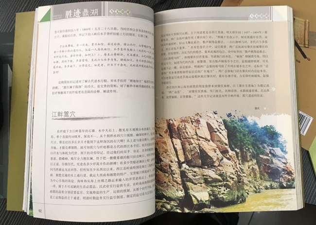 肇慶市文物普查隊在羚羊峽峽谷北岸的崖壁上發現纖痕,這個過程也收錄在了《人文鼎湖》一書中。劉麗芳把這本書送給我們時,還告訴我們,“肇慶市文物普查隊還發現,在纖痕下方江畔靠岸的石磡,以及水中的大石上,散見有很多不規則分布的篙穴。這些篙穴穴口呈圓形,單個直徑約10 厘米,深淺不一。從個別積水的穴口觀察,深度估計超過一尺。”劉麗芳的話讓我們再次慨嘆船工們的不易,畢竟,如何深的篙穴,那要在多長的歲月里,經過多少次拼命用力的撐頂才能形成呀!