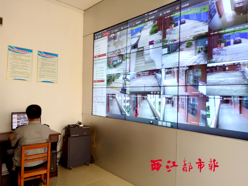 ????9月8日,記者前往梧州市第十四中學進行了解??偙O控室可謂校園安防監控系統的“中樞神經”,安裝在校園內部公共區域內的攝像頭會把實時捕捉到的畫面傳輸匯總到總監控室里的電腦終端,這些畫面不但會存儲到網絡云端,還可進行選段回放,并隨時選擇性投放到監控大屏幕上。