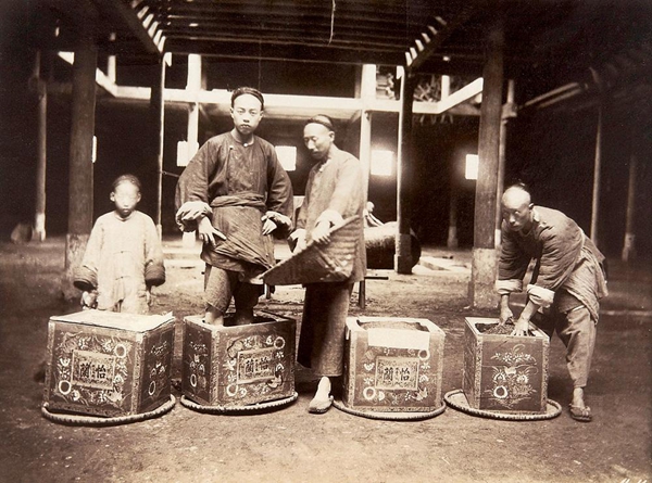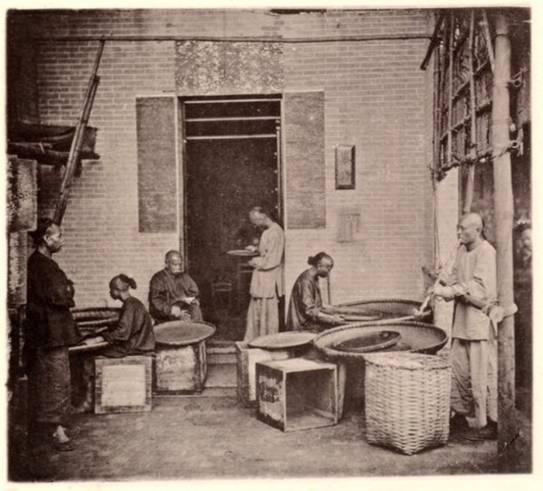 1870 年前后,廣州芳村的茶商雇傭工人,對收購回來的茶葉進行分揀制作(據(jù)《鏡頭前的舊中國——約翰·湯姆森游記》)。(網(wǎng)友“廣州二哥”提供)