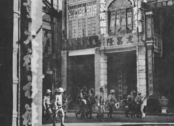 1938 年10 月22 日,侵華日軍掃蕩廣州市區(qū),經(jīng)過一家茶樓。(網(wǎng)友“田豐1052”提供)