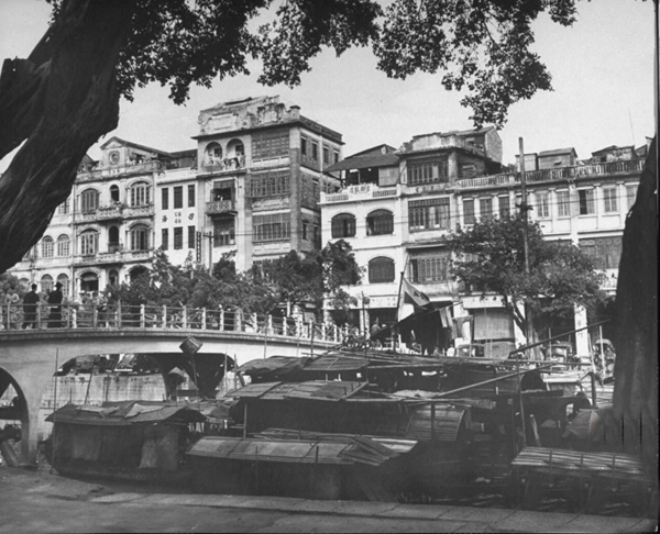 1949年3月,廣州沙面河道的西端,大量運(yùn)貨的小船停泊在這里。(網(wǎng)友“一點(diǎn)又一點(diǎn)”提供)