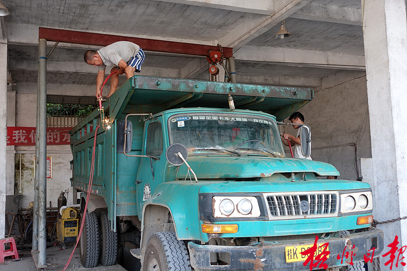 ????9月19日下午,在藤縣廣安汽車修理廠,工人師傅正在對(duì)非法加高攔板的大貨車進(jìn)行切割。