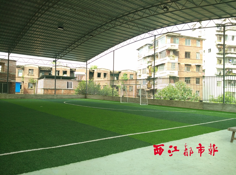 ????9月19日上午11時(shí)許,記者來(lái)到富民片區(qū)走訪,發(fā)現(xiàn)確實(shí)有很多足球場(chǎng)存在。在富民二路梧州港聯(lián)交通實(shí)業(yè)有限公司富民碼頭附近的倉(cāng)庫(kù)區(qū)內(nèi),開設(shè)有兩個(gè)足球場(chǎng),兩個(gè)羽毛球館,其中一個(gè)足球場(chǎng)是“空中球場(chǎng)”,建在梧州港聯(lián)交通實(shí)業(yè)有限公司一間一層高的倉(cāng)庫(kù)屋頂上,該屋頂鋪設(shè)了草坪,加蓋了頂棚,周圍用鐵絲網(wǎng)圍起來(lái),沒(méi)有任何隔音設(shè)施。而距離屋頂球場(chǎng)幾十米處,就有幾棟居民樓,其中,富麗花園小區(qū)的一棟居民樓距離該球場(chǎng)最近,中間只隔了幾間倉(cāng)庫(kù)。中午時(shí)間,并沒(méi)有市民來(lái)球場(chǎng)運(yùn)動(dòng),因此幾處球場(chǎng)顯得相當(dāng)安靜。
