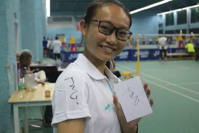 ????年僅15歲的小裁判黃燕瑩獲得了李寧的兩個親筆簽名。她說,簽了名的衣服不洗了!能看到李寧本人好開心,這鼓舞著自己以后在裁判的學習和工作中更加努力呢。