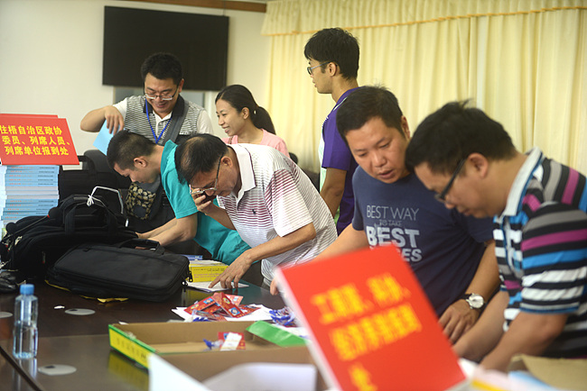 ????9月25日,參加市政協十二屆一次會議的政協委員在辦理報到手續,領取會議文件材料。