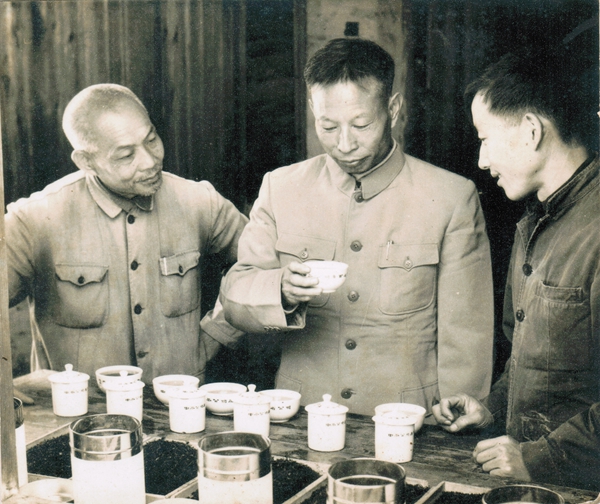 上世紀(jì)50 年代,梧州茶廠老廠長(zhǎng)安進(jìn)才(中)和老職工歐偉權(quán)(左)、童漢文在對(duì)六堡茶進(jìn)行審評(píng)。(何志強(qiáng)提供)