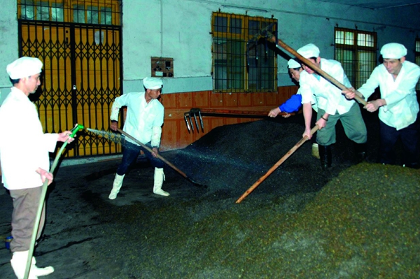 在梧州茶廠精制加工六堡茶的渥堆車(chē)間里,工人們對(duì)茶堆灑水以便發(fā)酵。(麥朝樞/攝)