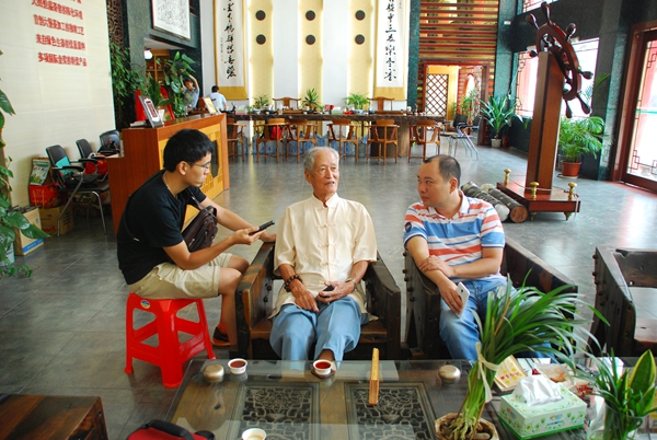 劉福生(中)向本報(bào)記者講述梧州茶廠組建的往事。(記者 楊麥/攝)