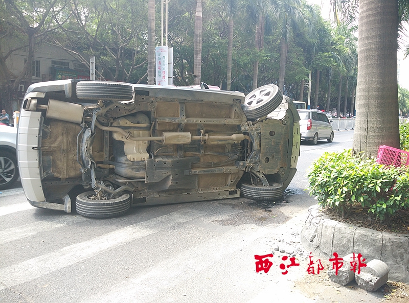涉事車輛撞上花基后,側(cè)翻在斑馬線上。 陳雨燕/攝