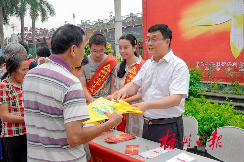 ??? 9月24日,在鴛江麗港廣場,中國人民銀行梧州市中心支行工作人員在向市民講解反洗錢知識。