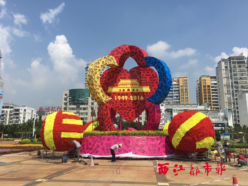 ??? 9月26日,工作人員正在對市政廣場上以“熱愛祖國 喜迎國慶”為主題的花卉布置點進行最后造型加工,并將在該造型旁擺放近一萬盆的時花進行裝飾。? 西江都市報記者 謝韻/攝
