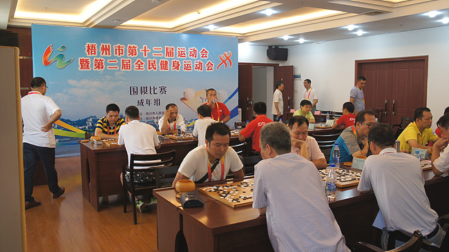 ????9月26日上午8時30分,梧州市第十二屆運動會暨第二屆全民健身運動會成年組圍棋項目開賽,這也是本屆市運會最后一大比賽項目。比賽首日,來自萬秀區、蒼梧縣等12支代表隊的參賽棋手在市總工會大樓12樓會議室內切磋棋藝、棋盤廝殺。