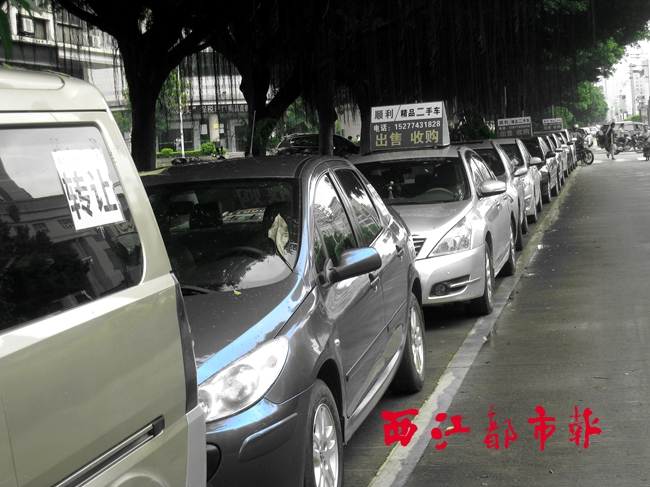 在新興二路一段非機(jī)動車道的臨時停車位上,有二手車交易商家將二手車停放在此推銷。(通訊員 李水養(yǎng) 攝于2016年8月15日)