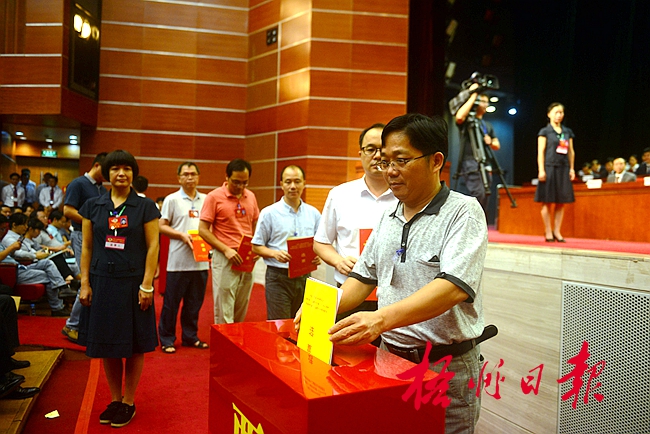 9月28日,市政協十二屆一次會議舉行大會選舉,選舉產生了政協梧州市第十二屆委員會主席、副主席、秘書長、常務委員。圖為與會委員們向投票箱投票。 李煜榮 攝