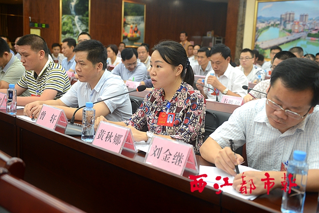 ?9月29日,出席梧州市十四屆人大一次會議的市人大代表繼續分組審議《政府工作報告》。圖為岑溪市代表團的人大代表在分組審議中發言。 西江都市報記者 蒙紹松/攝