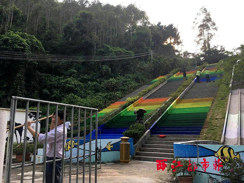??? 為迎接國慶節,太和公園進行了景觀提升改造工程。其中,通往太和公園動物園二區的必經之路百步級,也在近期被工作人員粉刷上彩虹般的色彩,既增加了公園的亮點,也激發了游客游覽的興趣。