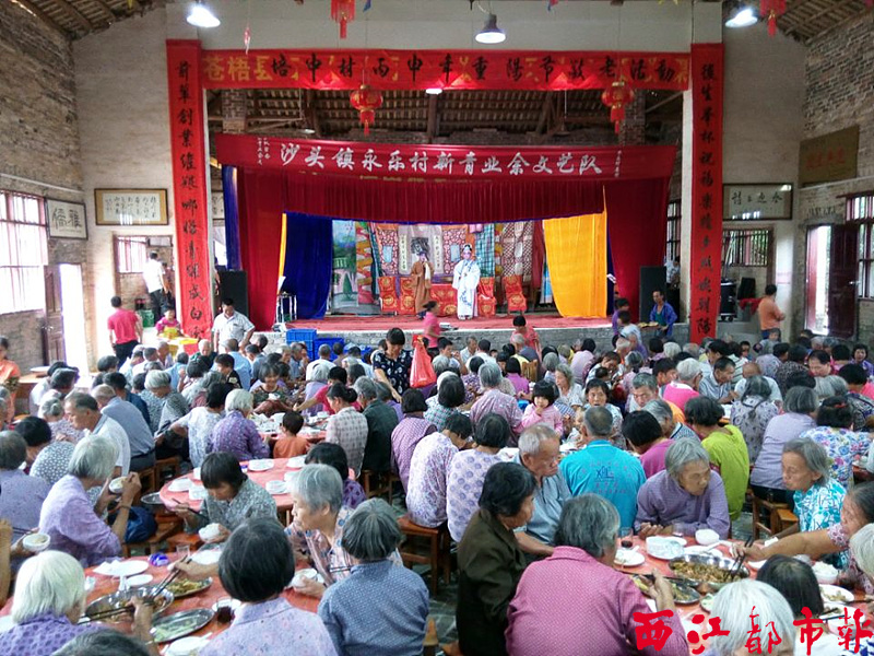 ????當天,培中村重陽節敬老活動在這里舉行。場下,100桌宴席坐得滿滿當當,老人家們喜氣洋洋;舞臺上,來自沙頭鎮永樂村的新青業余文藝隊的演員分別表演《郭子儀祝壽》、《骨肉團聚》等劇目,看到精彩處,老人家們不時喝彩。