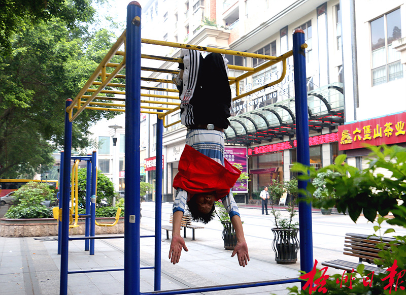 ????82歲老人陳作英居住在原梧州地委大院內(nèi),他有一獨(dú)門絕活——頭頂?shù)孛婺_朝天健身運(yùn)動(見下圖)。凡見識了這個(gè)老人,都會不約而同地稱贊道:“你在梧州市算得上一個(gè)奇人。”