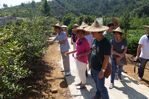 10月5日,多名外地游客在六堡蒼松茶園參觀茶樹種植。龍天傳/攝