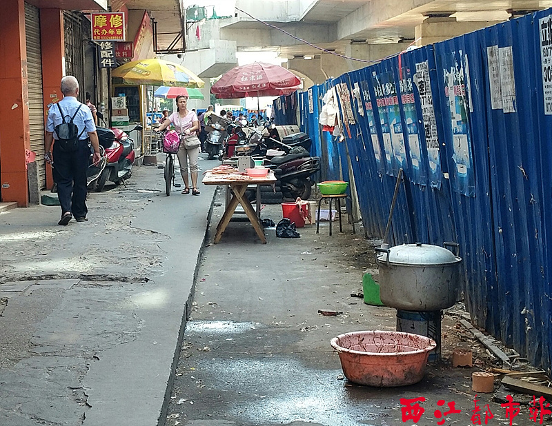 ????除了肉類攤檔,在該人行道及在建的西江四橋橋底下,還有幾家蔬菜攤檔、水果攤檔和早餐攤檔。這些攤檔的經營者沿路擺賣,有的早餐檔就擺在生肉攤檔旁邊,衛生狀況堪憂。
