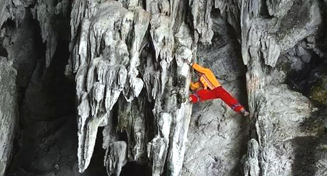 ????理由一:每天早上9點至下午5點,可在洞口觀看“驚、險、奇、絕”的徒手攀巖絕技表演,當地彝家漢子徒手赤腳攀越懸崖峭壁,穿梭于林立倒吊的鐘乳之中,驚險的動作和高超的技藝,令游人嘆為觀止。