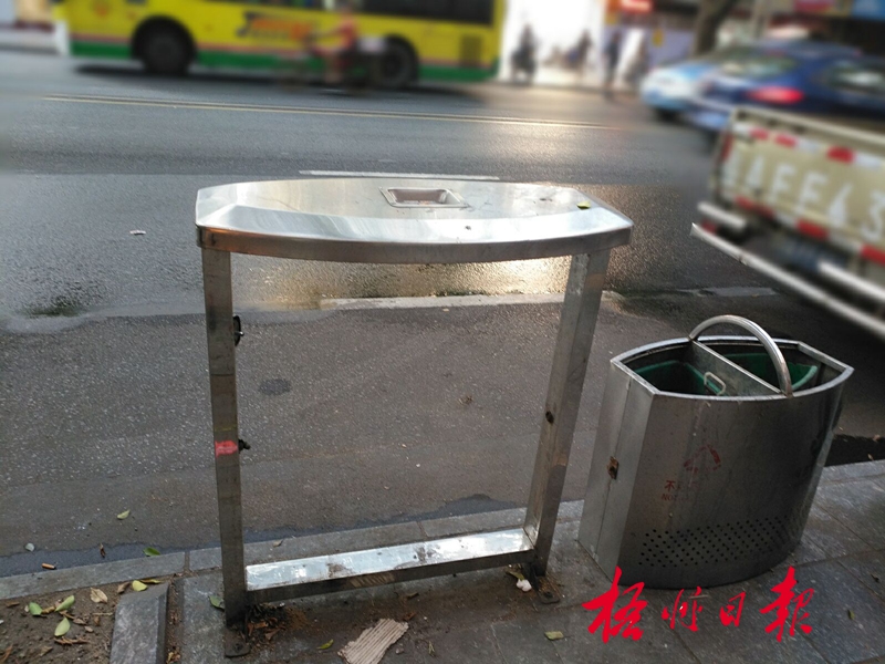 市財政局公交車站旁的一個垃圾箱箱體和鐵架分離。蘇云燕 攝