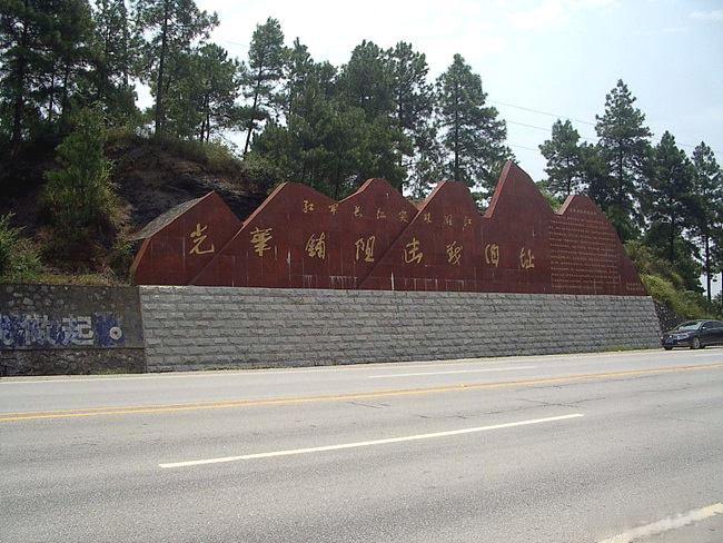 ????臨近縣城,便望見山頂那高聳藍天的紀念碑。進入碑園一看,確實氣勢非凡。上碑亭的臺階分四層,共184級,寓意紅軍突破湘江的曲折過程。主碑為三支步槍直插藍天,象征“槍桿子里面出政權(quán)”的真理。群雕由四個巨型頭像和五組浮雕組成,五組浮雕分別表現(xiàn)“紅軍、送別、長征、渡江、永生”的主題,據(jù)說這是全國最大的革命烈士浮雕。紀念館主要陳列國家領(lǐng)導人的題詞,紅軍經(jīng)過廣西的情況,突破湘江的經(jīng)過等各種實物、圖片和文字資料。