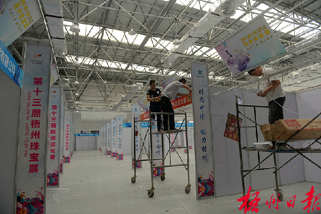 ????10月24日,在梧州毅德城國際珠寶交易中心,工人正在布置展廳。