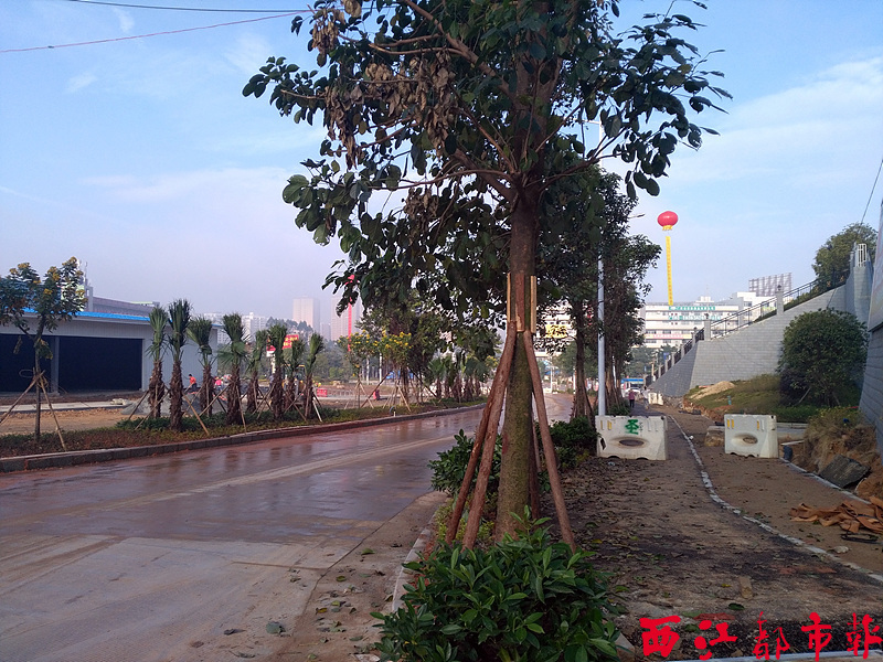 ????10月26日,在項目一期的施工現場,左幅道路非機動車綠化帶和中央隔離帶內,已經種上了綠化樹木及造型花卉,左幅道路路面硬化已經完工,路面平整寬闊。左幅路面與毅德國際博覽城之間預留了5米寬的通道,供行人和非機動車通行。