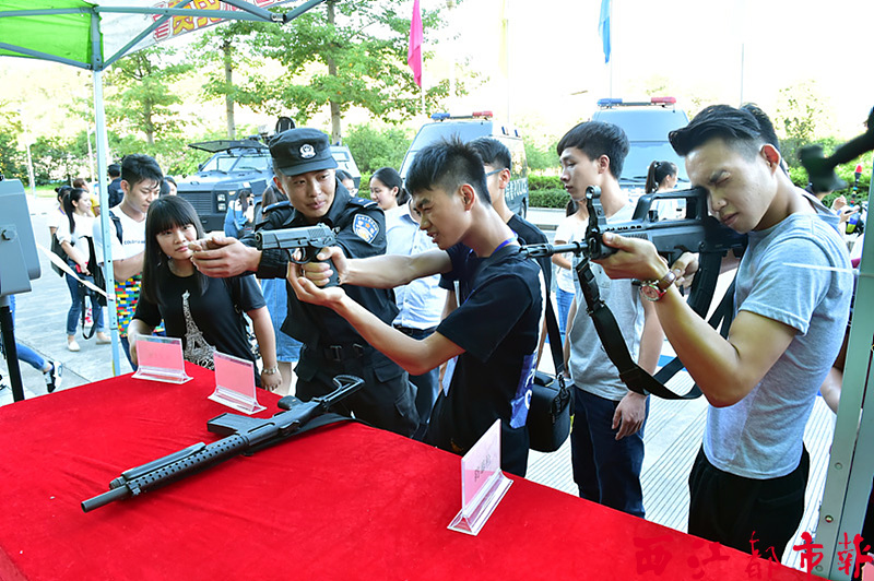 ????10月26日,梧州學院學生在公安民警的指導下,體驗如何使用警用槍械。