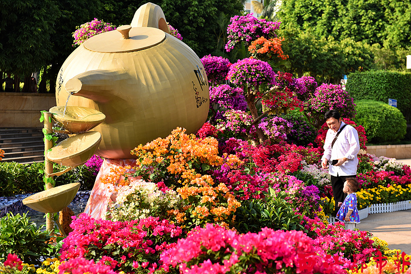 ????在龍圩區的展區內,一個極具嶺南風格的造型板前,借助小魚塘、小木橋等元素,打造出一個休閑天地。在寶巾花的簇擁下,市民在橋上行走,魚兒在橋下魚塘暢游,整個展區充滿了生機。不遠處的蒼梧縣展區,同樣也借助獨特造型吸引市民的眼球。展區的水池上,一個寫著“陶然”二字的大茶壺十分醒目,清水從壺嘴流出,經過三個茶杯造型一層一層地往下流,加上造景旁五顏六色的寶巾花、時花,使得整個蒼梧縣展區既有動態的流水潺潺,也有靜態的色彩繽紛。