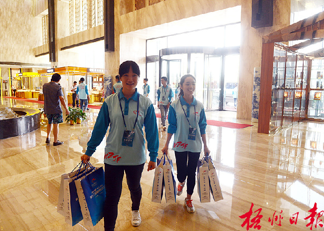 ????10月27日,青年志愿者在國龍大酒店準備寶石節會務資料。第十三屆梧州寶石節今日開幕。本屆寶石節共有300多名青年志愿者,分為會務、接待、禮儀等組別,參與有關服務工作。 李鴻榮 攝