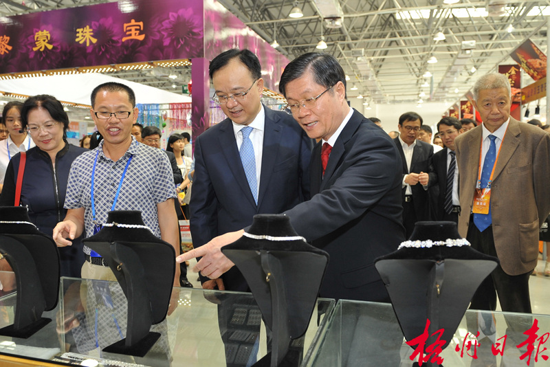 兩大展會(huì)特色鮮明,各類產(chǎn)品和展品琳瑯滿目,領(lǐng)導(dǎo)和嘉賓們邊走邊看,不時(shí)與參展商交談。在梧州寶石產(chǎn)業(yè)展區(qū),彭釗饒有興致地拿起一顆人工寶石細(xì)細(xì)觀賞。他說:“梧州的人工寶石產(chǎn)業(yè)取得了長(zhǎng)足發(fā)展,今后應(yīng)改進(jìn)工藝技術(shù),打造產(chǎn)業(yè)集群,以提升產(chǎn)品附加值和打響品牌為目標(biāo)推動(dòng)轉(zhuǎn)型升級(jí)。”他同時(shí)指出,寶石節(jié)是展示和宣傳梧州的重要平臺(tái),名特優(yōu)產(chǎn)品展銷會(huì)為企業(yè)開拓市場(chǎng)、提升產(chǎn)品影響力提供了載體,梧州市要利用好這個(gè)平臺(tái),鼓勵(lì)和支持企業(yè)做大做強(qiáng)。