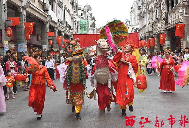 ????正當市民游客徜徉于古色古香的騎樓城街道,停駐在新穎大膽的涂鴉作品前細細觀賞時,騎樓城內忽然傳來了鑼鼓聲,迅速吸引了大家的注意力。循著鑼鼓聲傳來的方向,只見一人騎著白馬,一人騎著麒麟,前面各有童子引路,后面是兩人撐羅傘、兩人提花燈,隨著鑼鼓的節奏歡快起舞,不一會兒,就引來了許多市民游客圍觀。