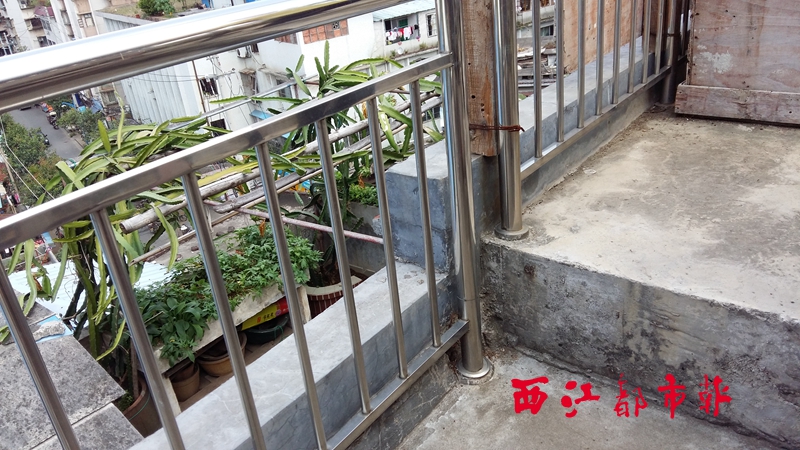 ????記者看到,13號住宅外墻外延磚塊的缺口處,有水流的痕跡。“每逢雨天,天臺就會變成一片澤國,天臺種的植物都泡在水里,雞也養不了。”吳女士說,現在所看到的13號住宅是五層半的建筑,事實上,有三層半屬于違章建筑,“違建部分緊挨我家天臺”。