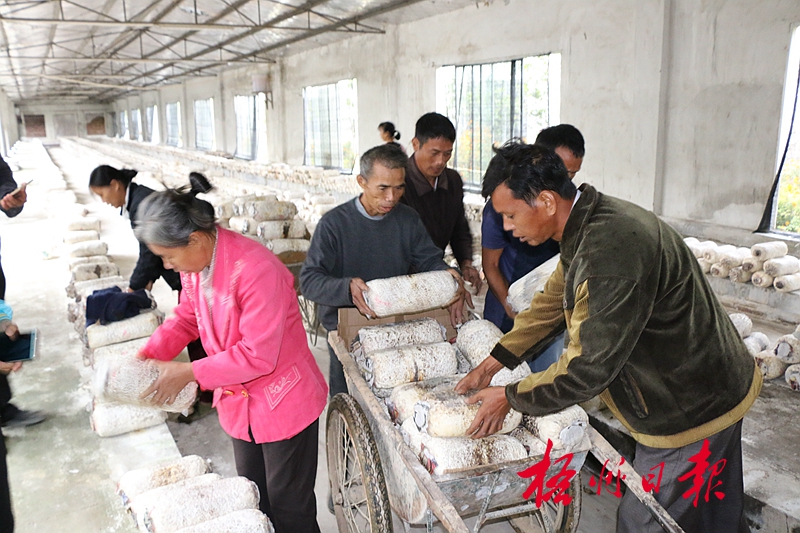 ??? 10月29日,蒙山縣新圩鎮貌儀村貧困戶領取政府扶持發放的食用姬菇和秀珍菇菌包。
