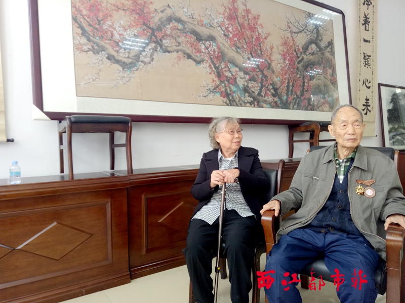 ? 陳朝儀(右)來到書畫回顧展的現(xiàn)場,與書畫愛好者交流。西江都市報記者 黃穎盈 攝