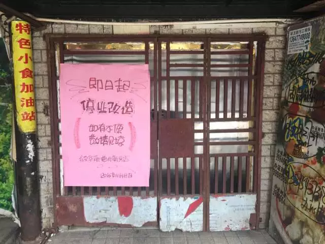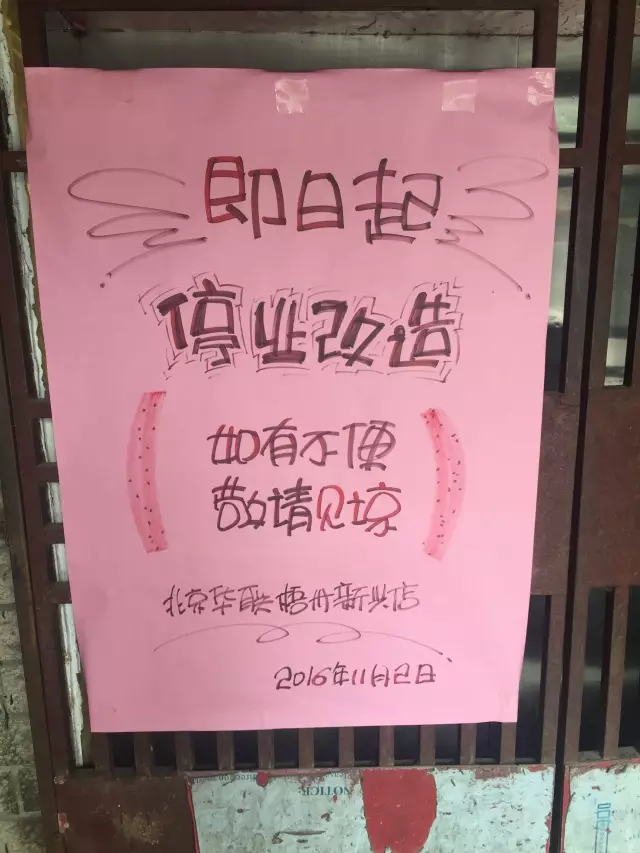 ????粉底黑字的通告上的一段話:“即日起,停業(yè)改造。如有不便,敬請見諒。北京華聯(lián)超市梧州新興店。2016年11月2日。”