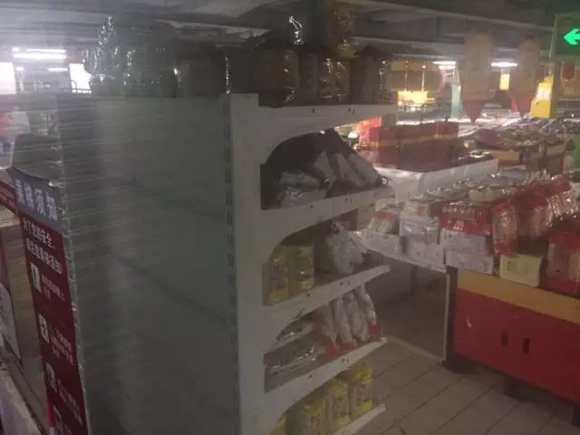 ????超市貨架上依然擺滿商品,與平時營業(yè)時候并無兩樣。