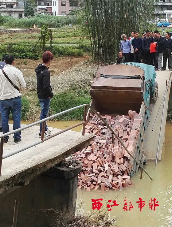 ????11月1日,來自三堡鎮(zhèn)新安村的秦金峰,幫同鎮(zhèn)的振大村大社片一名村民運紅磚建房。當日晚11時25分,秦金峰駕駛一輛載重約8噸紅磚的農(nóng)用車,途經(jīng)糯垌河上的大社大橋。當車子駛到橋中間,車子后面的橋面突然發(fā)生斷裂,車子掉進離橋面有2.5米落差的河里。